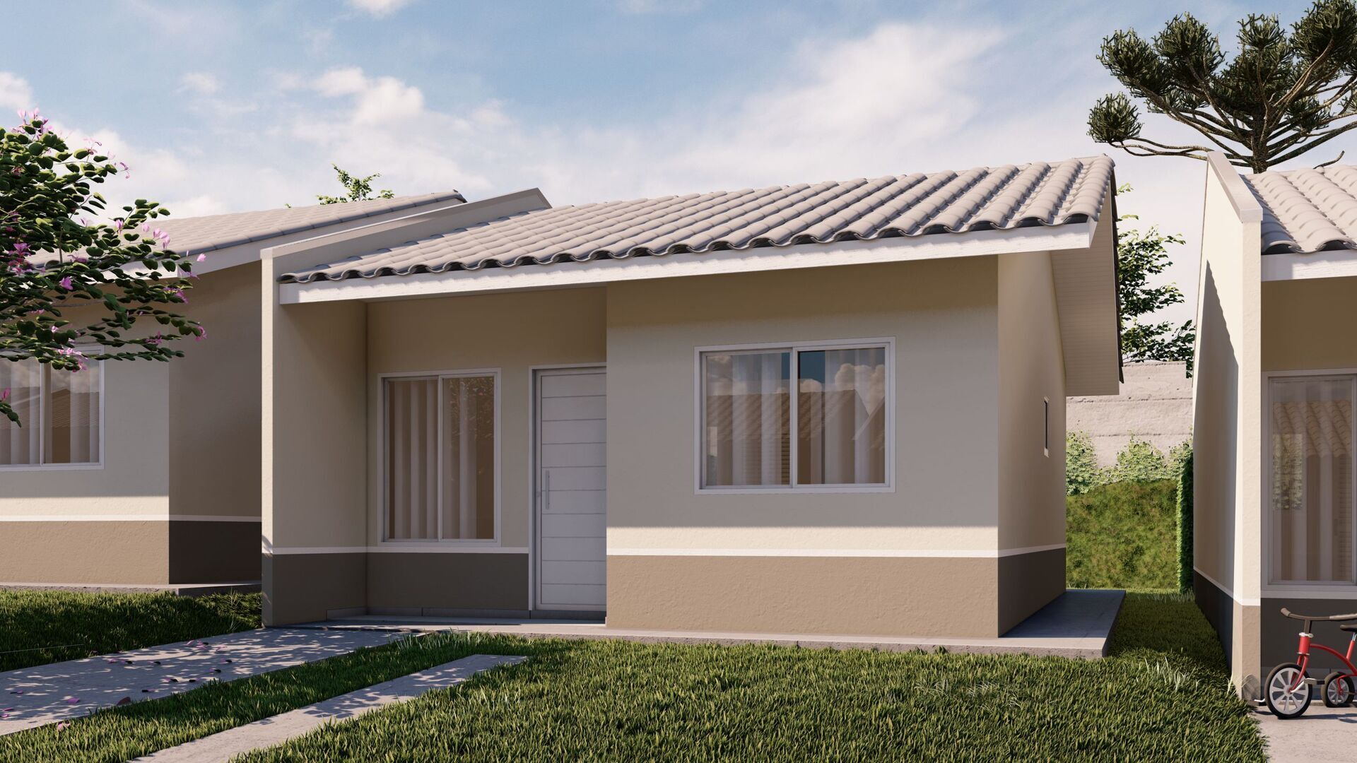 A área de uso comum conta com 3 praças de convivência, duas quadras de futebol, sendo uma de grama e outra de concreto, piscina, salão de festas mobiliado e parquinho.